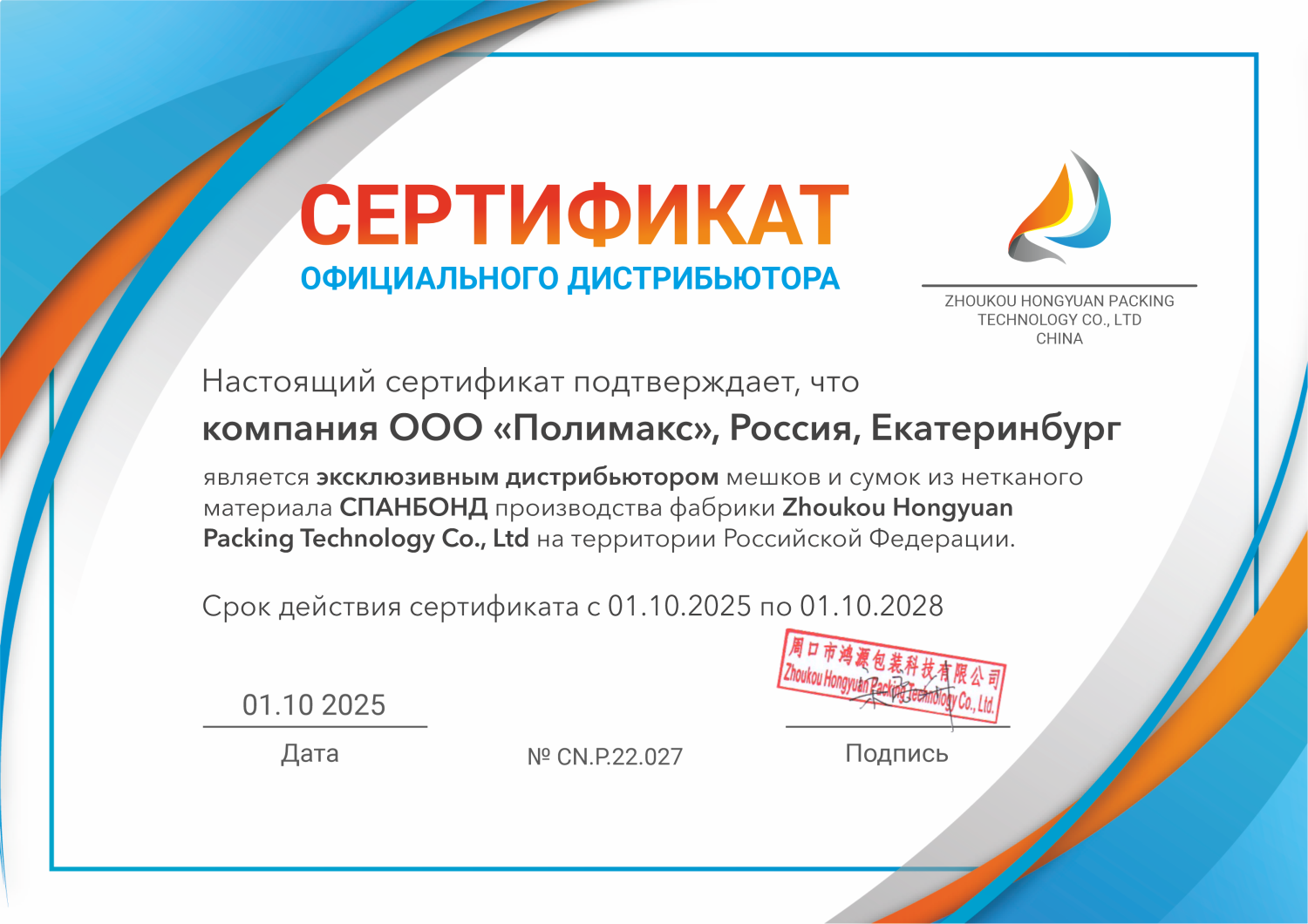 Сертификат подтверждает, что ООО "Полимакс" является эксклюзивным дистрибьютором производителя мешков и сумок из спанбонда фабрики Zhoukou Hongyuan Packing Technology Co., Ltd на территории Российской Федерации.